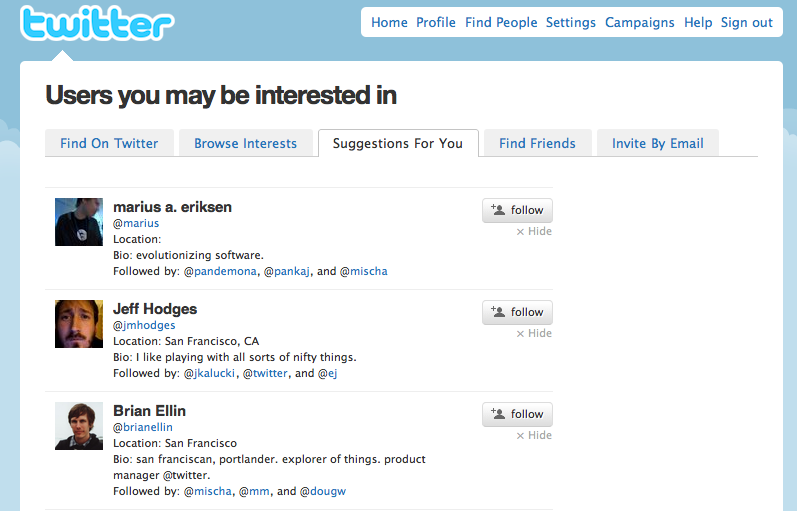 With more than a hundred million users on Twitter, there are sure to be at least dozens of accounts out there that will reflect your interests. The trouble is finding all of them. Today we’re beginning to roll out a simple, but powerful new feature to help address that — “Suggestions for You”. The algorithms in this feature, built by our user relevance team, suggest people you don’t currently follow that you may find interesting. The suggestions are based on several factors, including people you follow and the people they follow. You’ll see these suggestions on Twitter.com and the Find People section. If you like a suggestion, click “follow”; if you don’t, click “hide,” and we’ll try not to suggest that user again.