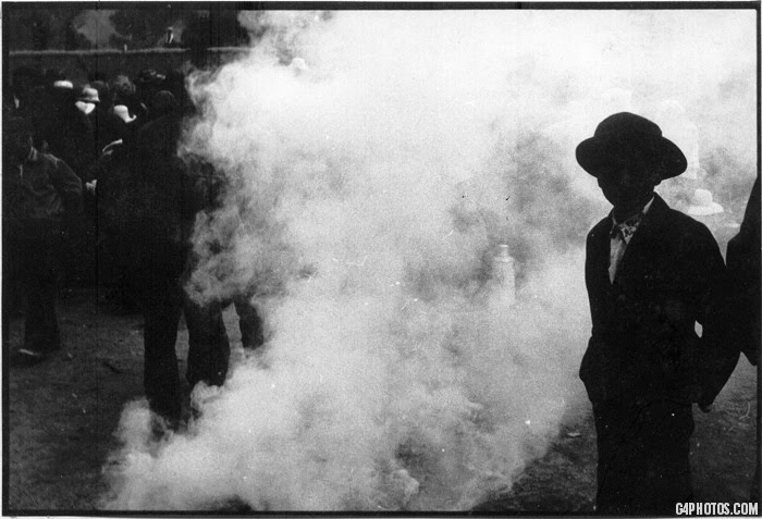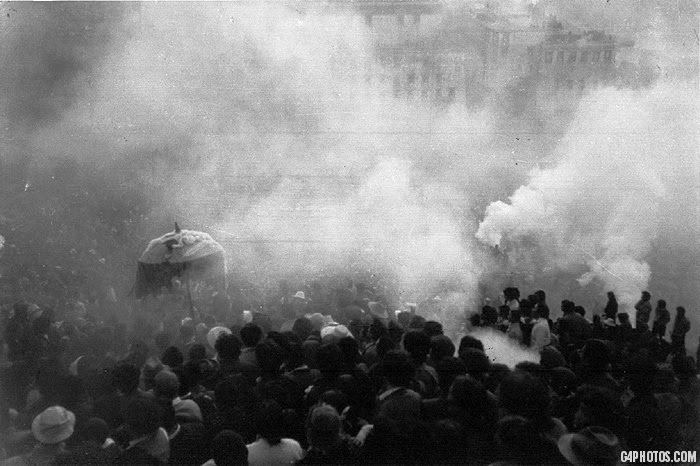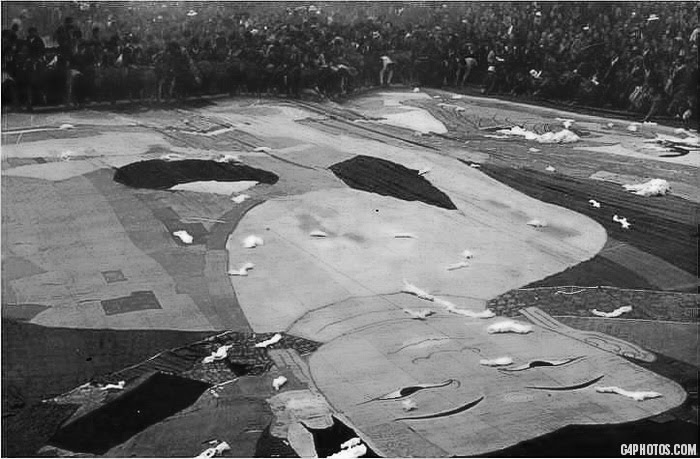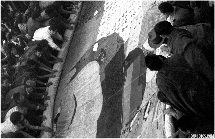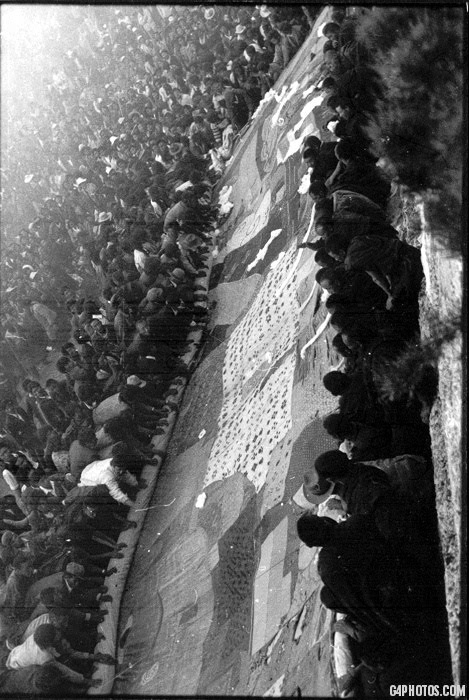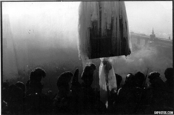 天色渐转亮,八时,法号重新吹响,喇嘛们唱着歌号,抬出大佛卷轴。我用傻瓜相机拍了第一张照片(要用闪光灯),引动其他人纷纷拍照。我的相机中装的是黑白100度的卷,拍了13张,觉得还应拍彩卷,遂换200彩卷。因傻瓜相机倒片手柄坏,倒片极慢,耽搁了时间拍照。扛佛像的队伍高唱号子行进,沿路围观的人极多,纷纷往佛像卷上扔哈达,拼命挤向前去用头触顶佛像卷,以至扛佛像队伍行进缓慢。满山这里那里点起一堆堆的香料,烟雾弥漫,空气浑浊,但使气氛很强烈。八点半,行进到一半,天色已可以用400度黑白胶卷1/30秒拍。8时40分,400度胶卷用完,换上100度拍,天色已可以使用1/60秒,但色彩仍步鲜明而发暗黑。