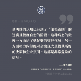 像一位微博用户就评论道“董明珠的认知已经到了‘闭关锁国’的迂腐且极度自恋的阶段。这种病态的傲慢一方面给了她足够的管理气场,另一方面格力内部绝对会出现大量投其所好的决策和企业氛围。这都是非常危险的信号。”之后,就连公开批评董明珠的胡锡进也遭到了网络围攻,从这一点说,确实越像女版习近平,也就越安全,也难怪董明珠曾对王自如等人说“你不要想很多,只要按照总书记那个讲话去做,就非常好”。