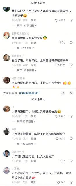评论区却是一片讽刺声:“把国衰说成快乐开心,主持人也是专业!”、“人家是真没招了,你搁这环保又快乐”、“正能量满满,连低工资都能包装成清新脱俗”。
