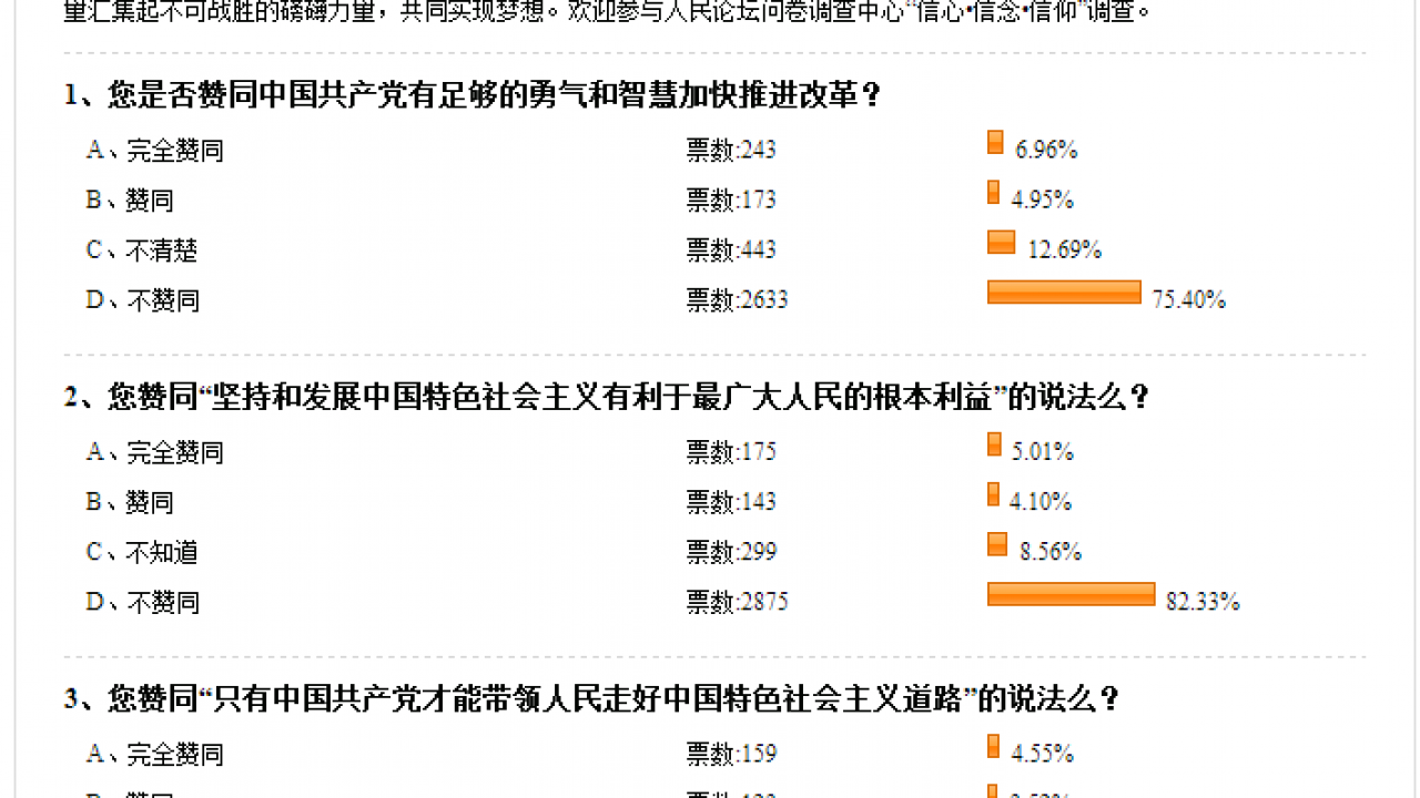 2023年10月12日 (四) 21:48 问卷调查中国特色社会主义.png文件 78 KB Xinchen 人民日报旗下的人民论坛网于3月27日发起了一则名为“信心•信念•信仰”的网络问卷调查。问卷的前言称习近平的“中国梦”重燃了中华民族伟大复兴的希望,而为了实现中国梦则需要中国人民的信心、信念、和信仰