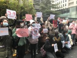 开庭首日,大约100名支持者在北京海淀区人民法院外对弦子表达支持。一些人举着“米兔”(#MeToo)标语,还有一群支持者各举一个汉字,拼成“我们一起向历史要答案”的标语。