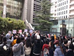 据亲临现场的人反应,人群在法院的正门聚集后没多久,保安就过来叫停了举牌和拍摄,他们被赶往南门。南门不在正街上,不会吸引太多关注,但是窄窄的一条街站了大约500人,还是吸引了不少路人驻足观看。女权主义们自己准备的声援口号分发给志愿者,大家举着口号齐声对着前方一排记者的摄像头喊出:“我们一起向历史要答案!”[3]